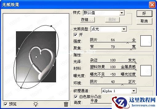 4.将路径转换为选区,用灰色填充(RGB参数为R218,G203,B206,并且一下所用到的米灰色都是这个数值),不要取消选区,到通道面板,新建一个通道,填充为白色到菜单-滤镜-模糊-高斯模糊,模糊半径为3,按CTRL+ALT+F再作一次高斯模糊,半径为2,然后再来一次,半径为1,回到图层1,到菜单-滤镜-渲染-光照效果,在调板中作(图3)一般设置,完成后如(图4)。