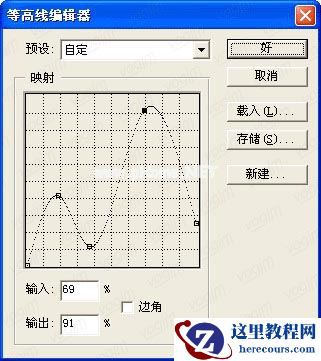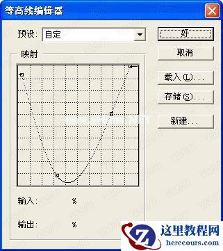6.将此图层再复制一个置于上面,再按CTRL+I,将颜色反转,双击此图层,在弹出的图层样式中选择浮雕,将其中的光泽等高线调节至(图6)样子。再钩选光泽效果,将其中的等高线调节为(图7)样式,完成后如(图8)。