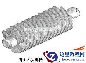SoiidWorks 2005有特征阵列的功能,可以对已有特征进行线性阵列或圆形阵列。我们可以对单头螺杆中的切除螺旋扫描特征进行圆形阵列,将上述重复的过程交给计算机来做,要做几头螺杆就作几个阵列,这样从单头螺杆只作一个圆形特征阵列就可以得到多头螺杆,非常简单方便。用这种方法生成的6头螺杆如图5所示。