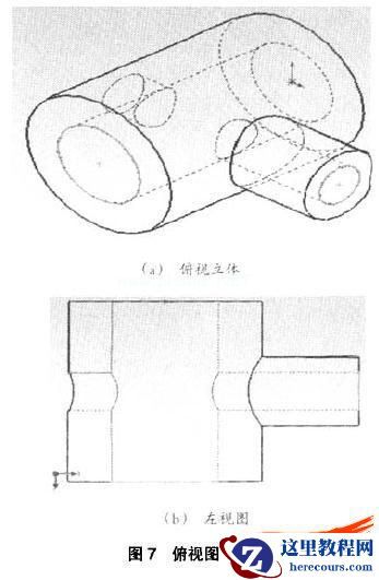 回转体内部交线是学生容易漏画和错画的地方,利用视图/显示/隐藏线可见功能,可以将内部交线清晰地显示出来,再利用标准视图功能观察其俯视图,结果如图7所示。