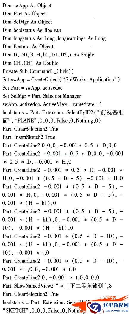 对于程序代码的编写,简单实用的方法是先录制使用Solidworks用户界面执行的操作,即录制宏,获得宏操作代码,将其复制添加到程序中"创建"控件的click事件下,然后在代码中找到定义实体模型的尺寸值,用对应的尺寸参数代替这些尺寸值。编辑修改以达到程序要求,通过程序驱动设计变量实现模型的建立和更新,这种方法编程较简单,通用性好。具体代码如下:
