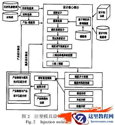 (2)模具设计模块是一个基于知识的产品模具自动设计过程.设计过程模拟专家设计,采取从里向外设计,首先确定产品型腔,包括侧抽芯,然后根据注射机参数设计型腔数目,选择模架,设计顶出系统,温度调节系统,最后生成模具的三维装配图.在这个自动化的过程中,每个步骤都需要调用知识库中的知识和规则以及设计事例的知识.这个模块还包括自动动态进行特征之间的尺寸检查和干涉检查等.