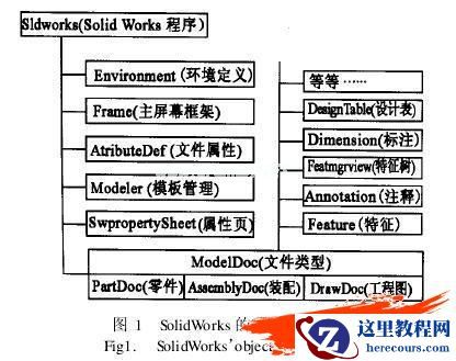 不管用VC++,VB,或者用VBA开发SolidWorks都要在调用SolidWorks对象的体系结构基础上进行.在SolidWorks的API中,其各种功能都封装在SolidWorks的对象中,和其他VB对象一样,具有自己独立的属性、方法.通过调用SolidWorks的对象的属性以及方法,可以实现各种功能.图1是SolidWorks的对象模型树.