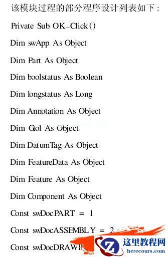 SolidWorks提供了基于OLE Automation的编程接口API(Application Programming Interface,应用编程接口),其包含数以百计的功能函数,这些函数提供了程序员直接访问SolidWorks的能力,可以被VB、C/C++等编程语言调用,从而可以很方便地对SolidWorks进行二次开发.