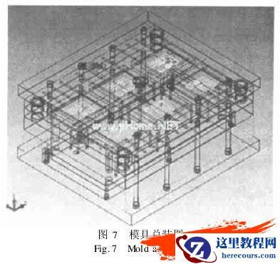 (10)模具设计向导第九步,完整的电话机壳注塑模具的总体结构方案设计完成,保存模具设计结果.全部零件和总体装配结构的模型文件按指定的目标文件路径保存.图7为设计完成的电话机壳塑料模具的3D总体结构图.