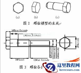 利用Solidworks提供的强大的基于特征的参数化实体造型功能生成标准件的模型库。首先我们生成主特征的二维草图(sketch),由草图经过拉伸、旋转和扫描生成标准件的主特征即基体,然后再在基体上加上其它一些辅助特征,如孔、倒角等,最终建立三维标准件库,图2表示了标准件-螺栓的模型的生成过程。