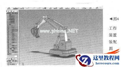同时,在产品设计过程中,为了更明确地表达产品结构,往往需要提供一张所有零件按拆卸关系放置的装配体图,这种装配体图即爆炸视图,通过此图可形象地再现装配体特征。在装配体环境下,在插人下拉菜单中选择〔爆炸视图〕,出现爆炸视图对话框。生成爆炸视图有两种方法:自动爆炸和手动爆炸。对工作装置通过设定合适的爆炸视角、爆炸方向和爆炸距离而生成的爆炸视图。