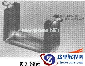 完成分析计算之后,系统自动得到应力应变位移等默认图解,我们根据需要添加Mises应力图解,显示最大注解和最小注解,如图3所示,根据计算后的应力应变位移及3.7的最小安全系数来判断该结构在使用时符合安全要求。