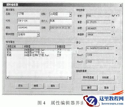 可通过属性编辑器来实现与三维CAD系统的集成。在属性编辑器中,不仅可对零部件的共有属性进行编辑,而且可保存零部件的特有属性。在特有属性中可以保存保存零部件尺寸名称和代号的关系。
