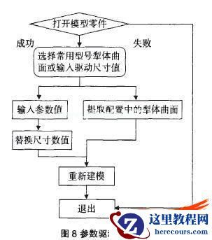 在OpenDocPage.h中定义所需要的组合框、数字框等,在OpenDocPage.cpp中,对COpenDocPage的构造函数COpenDocPage添加初始化代码.在COpenDocPage的析构函数~COpenDocPage中添加要释放的各种对话框。在Layout函数中添加各个对话框及描述.以犁体曲面为例。在组合框中选项的个数是通过常用犁体曲面型号的个数确定的,数字框的个数是通过犁体曲面的驱动尺寸的个数确定,程序流程图如图8所示。