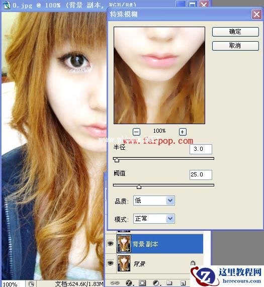 4、在特殊模糊对话框中调节各项的值,(本图使用的是默认值)。