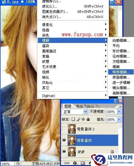 3、在背景副本图层中,选择菜单栏中的滤镜-->模糊-->特殊模糊。