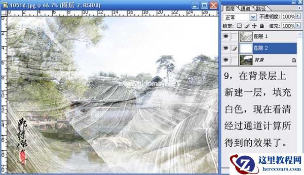9、在背景层上新建一层,填充白色,现在看清经过通道计算所得到的效果了。