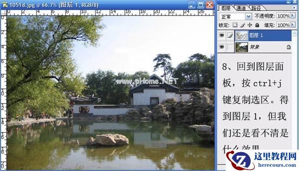8、回到图层面板,按 ctrl+j 键复制选区,得到图层1,但我们还是看不清是什么效果。
