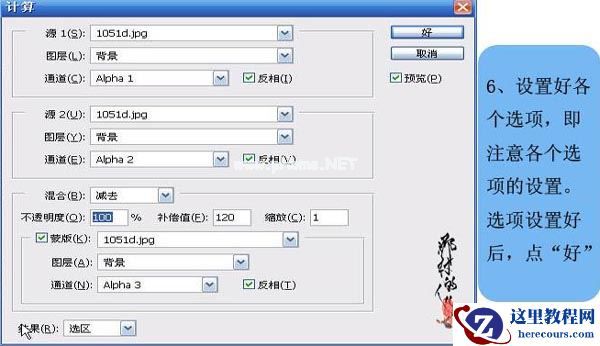 5、把素材图片四复制到Alpha 3 通道里,选中通道3,执行图像/计算命令,打开计算对话框。