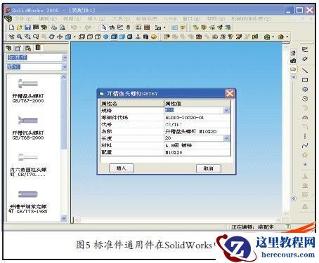 标准件通用件库建立后,主要实现在SolidWorks装配体环境中调用,根据前面的介绍,我们可以把所有程序代码生成 DLL插件后集成在SolidWorks界面,从而实现标准件通用件库随着SolidWorks程序起动后主动加载在装配体界面,如图5所示。