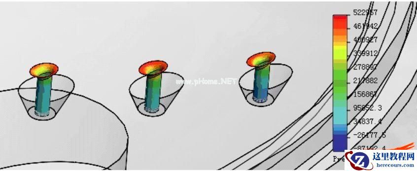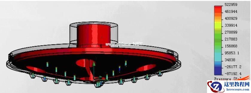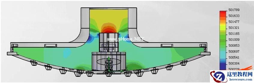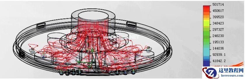 我们首先需要了解整个流场在腔体 中的状况,这里可以通过流线来查看水流在腔体内流动的状况,也可以通过动画的 方式显示,同时通过云图来表示各处的水 压、流速等分布情况,如图6所示。接着对于某些关键截面,我们还 要了解其压力分布,就需要在关键位置建立一个参考面,之后即可显示该截面上的压力分布云图,如图7所示。当然产品内壁所受到的压力对于 产品结构的影响非常重要,这里可以一 次性选择所有内壁面来显示其压力分布 云图,如图8所示。
