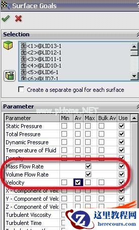 通过目标,我们可以得到一些重要的分析结果数据。如要得到出水口的体 积流量、质量流量和流速,则可以选择 出水端口的面,添加目标参数(见图4 和图5),这样在完成分析后,即可以通过Excel格式显示这些面上的详细参数。