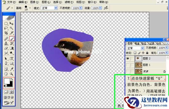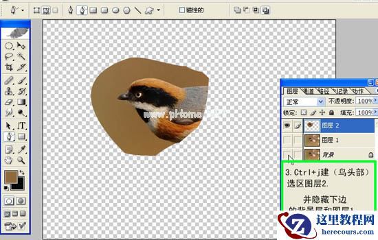 3、按Ctrl+j建(鸟头部)选区图层2。并隐藏下边的背景层和图层1(点击关闭小眼睛)。