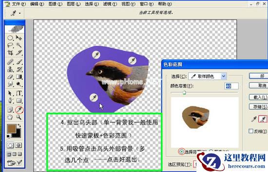 4、抠出鸟的头部(单一背景我一般使用快速蒙版+色彩范围)。