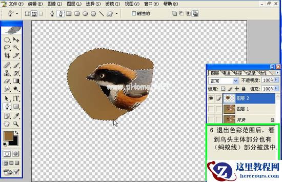 6、退出色彩范围后,看到鸟头主体部分也有蚂蚁线,部分被选中。