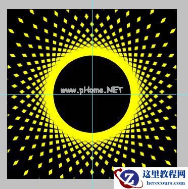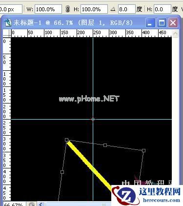 4、再次自由变换, 把图层1的中心点转移到参考线的中心交点上。如下图。并设置变换属性:角度为8度,按回车确定变形。