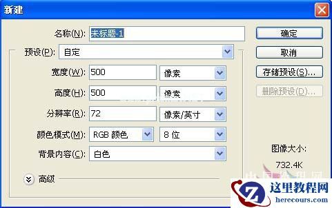 1、新建文件500*500PX,RGB,分辨率为72PX,背景为白色的文件。