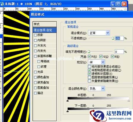 6、新建图层2,把图层1载入选区,选择—反向,填充任意颜色,取消选区。对“图层2”执行:图层—图层样式—混合选项—高级混合,把填充改为:0%,挖空选择为“深”,如下图。