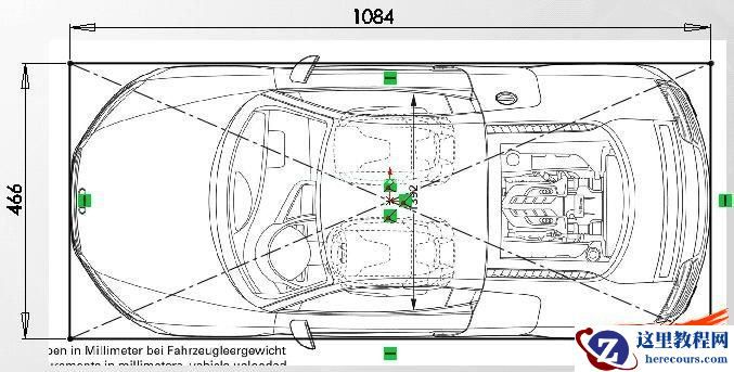 完成图片调整。为了定位准确,可以在上视基准面参考图片大小,绘制一个矩形,标注合适的尺寸,完成汽车图片的导入。可能需要反复调整图片的大小及矩形的大小,最终达到类似于图4的效果,单击右方角的
