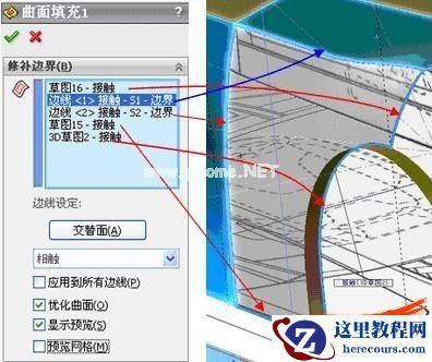 ,按图16所示,分别选中步骤8中的两个基准面和步骤7中完成的放样曲面,单击“确定”按钮