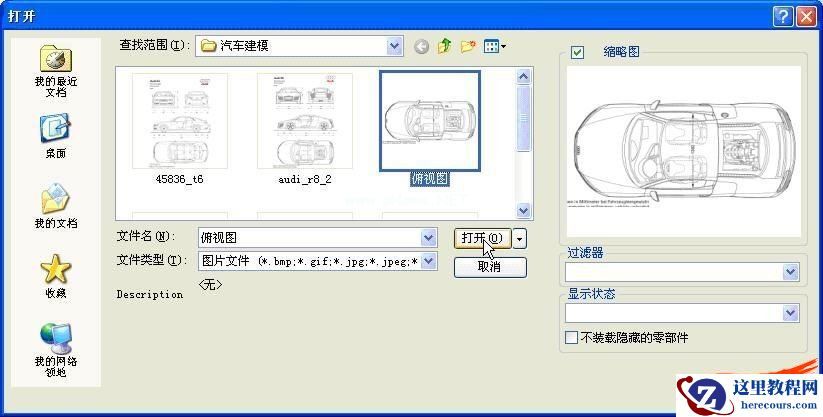草图图片”,在弹出的对话框中选中“俯视图”图片,单击“打开”按钮,如图3所示,图片将显示在上视基准面中。