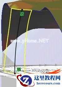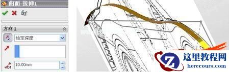 12)新建一个与前视基准面平行且大致与车轮处外壳边线重合的基准面,然后在该面绘制车轮处汽车外壳的形状,并参考步骤2拉伸出一定长度(如10mm)的曲面,如图20所示。
