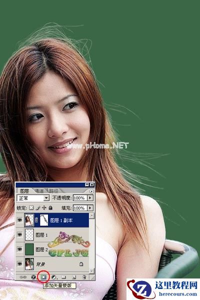 05、抽出后点击红圈处给图层1副本加蒙版,用黑画笔修饰掉边缘杂色,用70%灰画笔涂抹边缘的发丝,为使抽出后多余的黑色降低,进一步与图层1融合,完善发丝的效果。