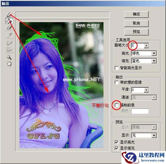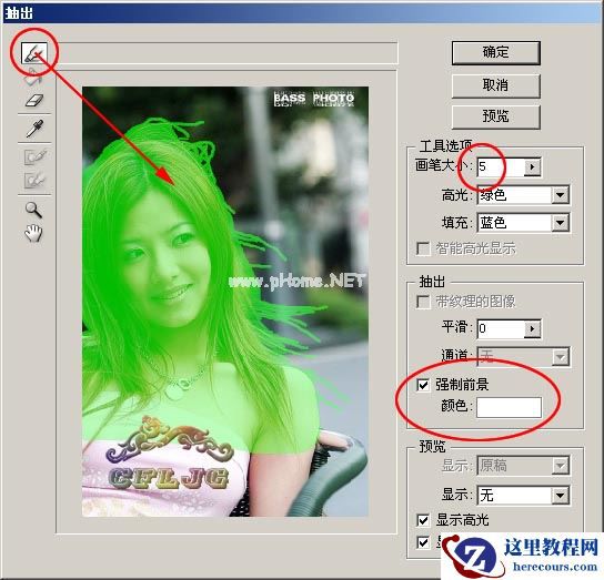 02、在图层1执行滤镜--抽出命令。在强制前景处打勾,颜色选择白,为抽取头发的高光发丝。用高光器工具涂抹绿色,人物边缘的发丝要用小一点的笔触涂抹,这里选择了5。