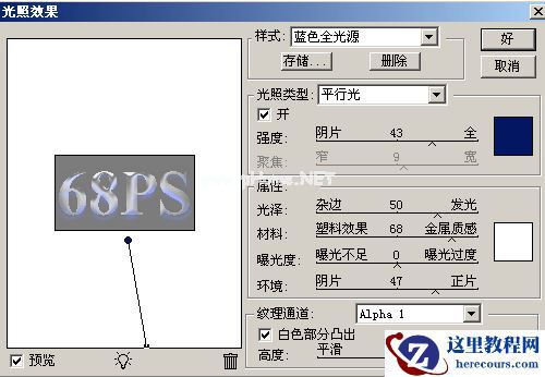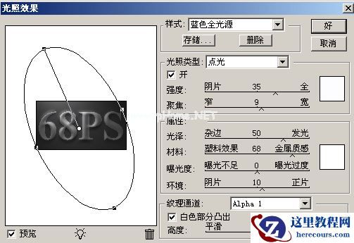 3.回到图层面版,选择菜单 : 滤镜 > 渲染 > 光照效果 参数设置如图5 效果如图6