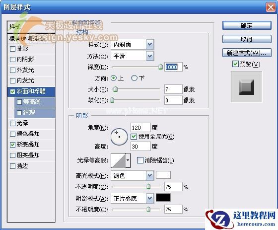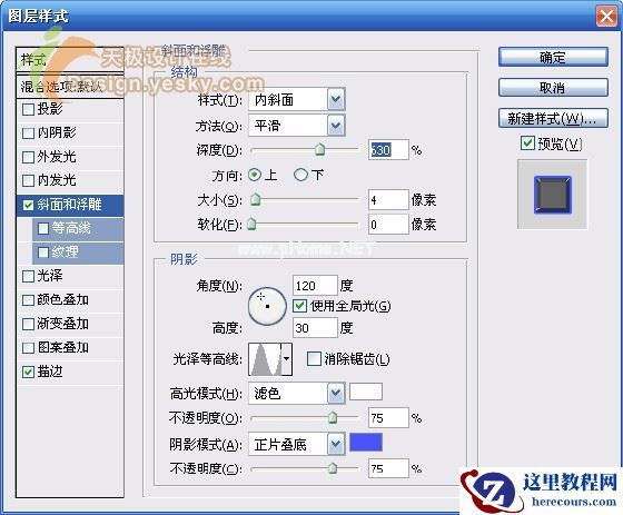 7.在图层调板中双击最上面图层名称右侧空白处(或选择“图层>图层样式>斜面和浮雕”),按图11所示设置“斜面和浮雕”样式。