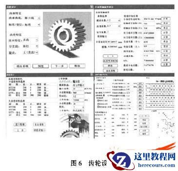 在设计的一开始,用户先进行相关的初始参数的选择,比方说齿轮的材料、精度等。按照保证齿面接触强度和齿根弯曲强度两项准则进行计算,设计出齿轮的基本参数如模数m,齿数z等,具体设计流程如图3所示。本软件系统采用了向导型设计界面,使用方便,部分设计界面如图6所示。