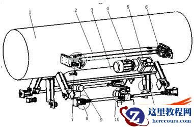 牵引装置主要由牵引机构、压紧机构、调节机构三部分组成,牵引机构是整个牵引装置的核心部分。调节机构主要是以减速机作为动力,通过万向联轴器、链轮、锥齿轮及丝杆的传动来实现调节功能。对于与管道夹角较小的橡胶带,在橡胶带上加装汽缸来实现压紧功能,而对于管道夹角较大的橡胶带则只需依靠管道自身的重力来加压。