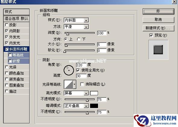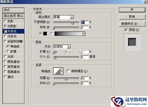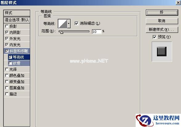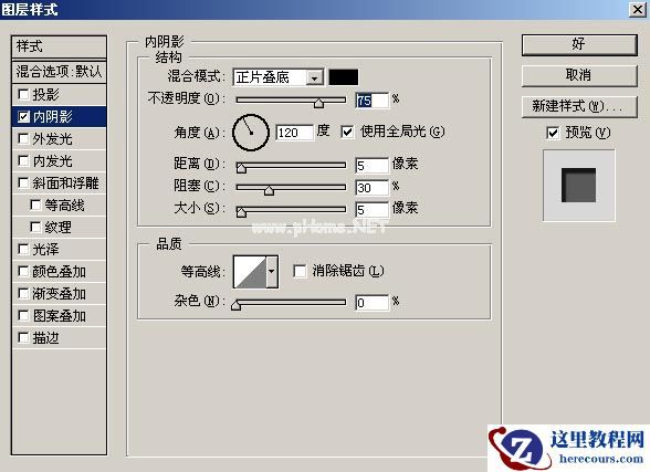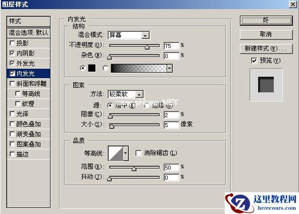 7.选择图层1,选择图层/图层样式/混合选项,分别为图层1添加内阴影如:图8、外发光如:图9、内发光如:图10、斜面和浮雕如:图11、等高线如:图12,设置如下: