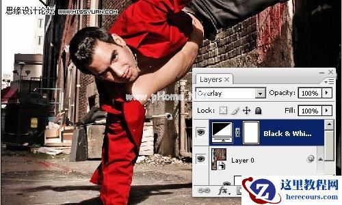 5、改变黑白蒙板图层的模式为“叠加”。 我们应该获得了高对比度的效果!