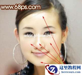 5、五官部分修复好后,人物的轮廓部分清晰了很多,不过脸部的质感还不够,下面修复一下。新建一个图层,盖印图层,选择减淡工具,压力为:10%左右,在图6所示箭头位置,慢慢涂高光