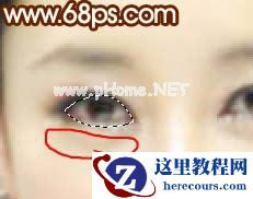 转为选区后用加深工具加深眼睛的内边缘,然用加深/减淡工具把眼珠的暗部及高光涂出来。取消选区后再修复眼袋,如图2红线位置,用吸管吸取附件皮肤颜色,然后用画笔轻轻压一下,画笔透明度:10%左右,修复好的大致效果如图