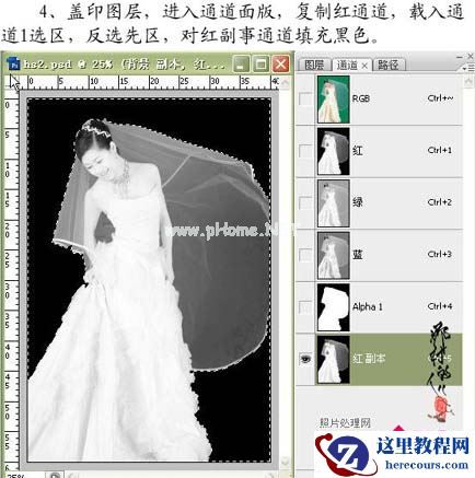 4、新建一个图层,按Ctrl + Alt + Shift + E盖印图层,进入通道面板,复制红色通道,载入通道1选区,按Ctrl + Shift + I反选选区,对红副本填充黑色。
