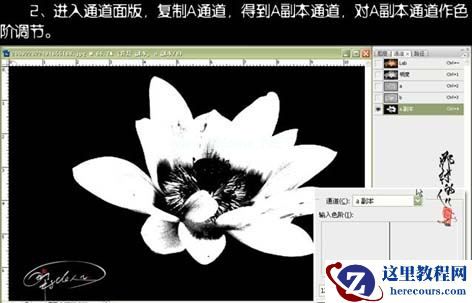2、进入通道面板,把a通道复制一层,得到a副本通道,然后对a副本通按Ctrl + L调整色阶,参数设置如下图。