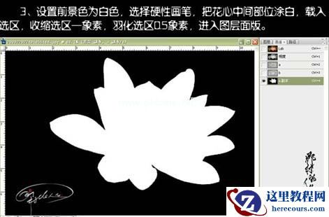 3、把前景颜色设置为白色,选择硬性画笔,把花心中间部分涂白,载入选区,选择菜单:选择 > 修改 > 收缩,数值为1,按Ctrl + Alt + D羽化,数值为0.5,然后点图层面板。