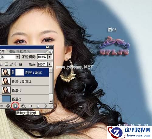 06、点击红圈处,在图层1副本层加蒙版,用黑画笔仔细在人物主体外涂抹出新的背景及发丝。见图06