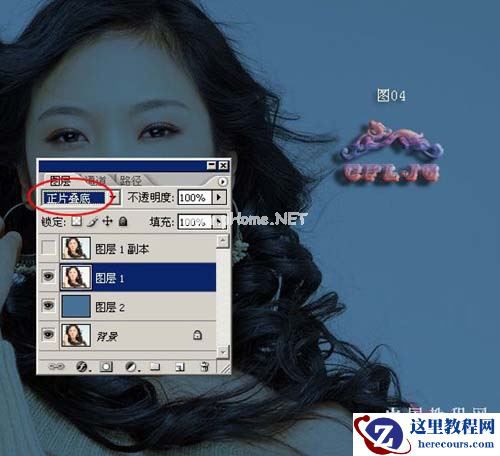 04、图层的模式设置为正片叠底, 这时微细的发丝就得到了。见图04