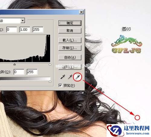03、在图层1执行图像--调整--色阶命令,用白吸管在图中的红圈处点一下,这样原来的蓝灰色的背景就变成了白色的背景了。见图03