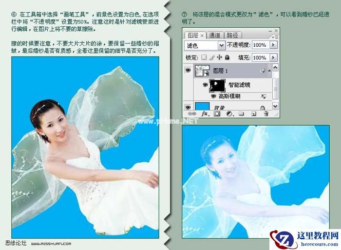 7、将该层的混合模式改为“滤色”,可以看到婚纱己经透明了。