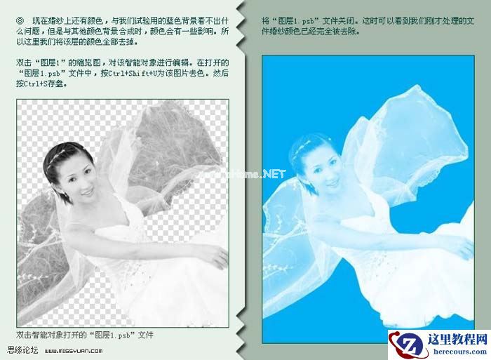 8、现在婚纱上还有颜色,与我们试验用的蓝色背景看不出什么问题,但是与其它颜色合成时,颜色会有一些影响,所经这里我将该的颜色全部去掉,双击“图层1”的缩览图,对智能对象进编辑,在打开的“图层1,psb”文件中,按Ctrl+shift+u为该图片去色,然后按Ctrl+s存盘。